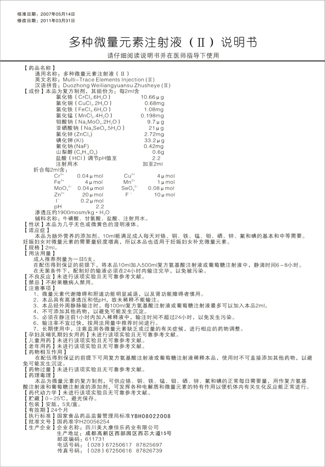本品為腸外營養(yǎng)的添加劑。10ml能滿足成人每天對鉻、銅、鐵、錳、鉬、硒、鋅、氟和碘的基本和中等需要。妊娠婦女對微量元素的需要量輕度增高,所以本品也適用于妊娠婦女補充微量元素